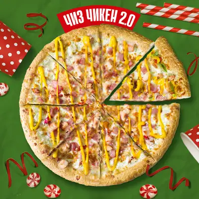 Фирменный сырно-чесночный соус, копченая куриная грудка, ветчина, тянущаяся моцарелла, горчичный соус сверху и посыпка из жаренного лука.