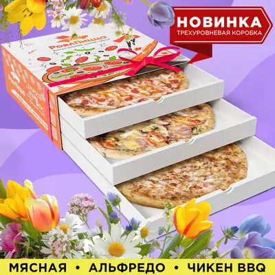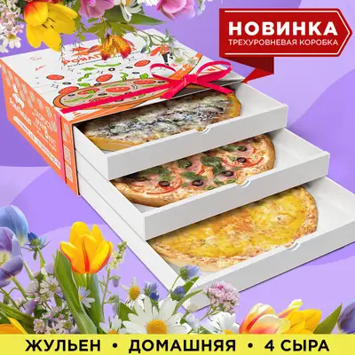 Пиццы на тонком тесте, 30см: Жульен, Домашняя и 4 сыра в лимитированной трехярусной коробке. Доступно на самовывоз и доставку