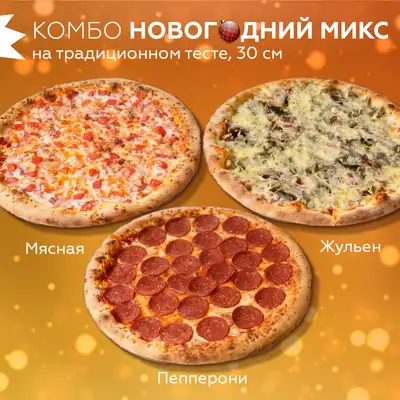 Сытные пиццы 30см на традиционном тесте: Мясная, Пепперони, Жульен